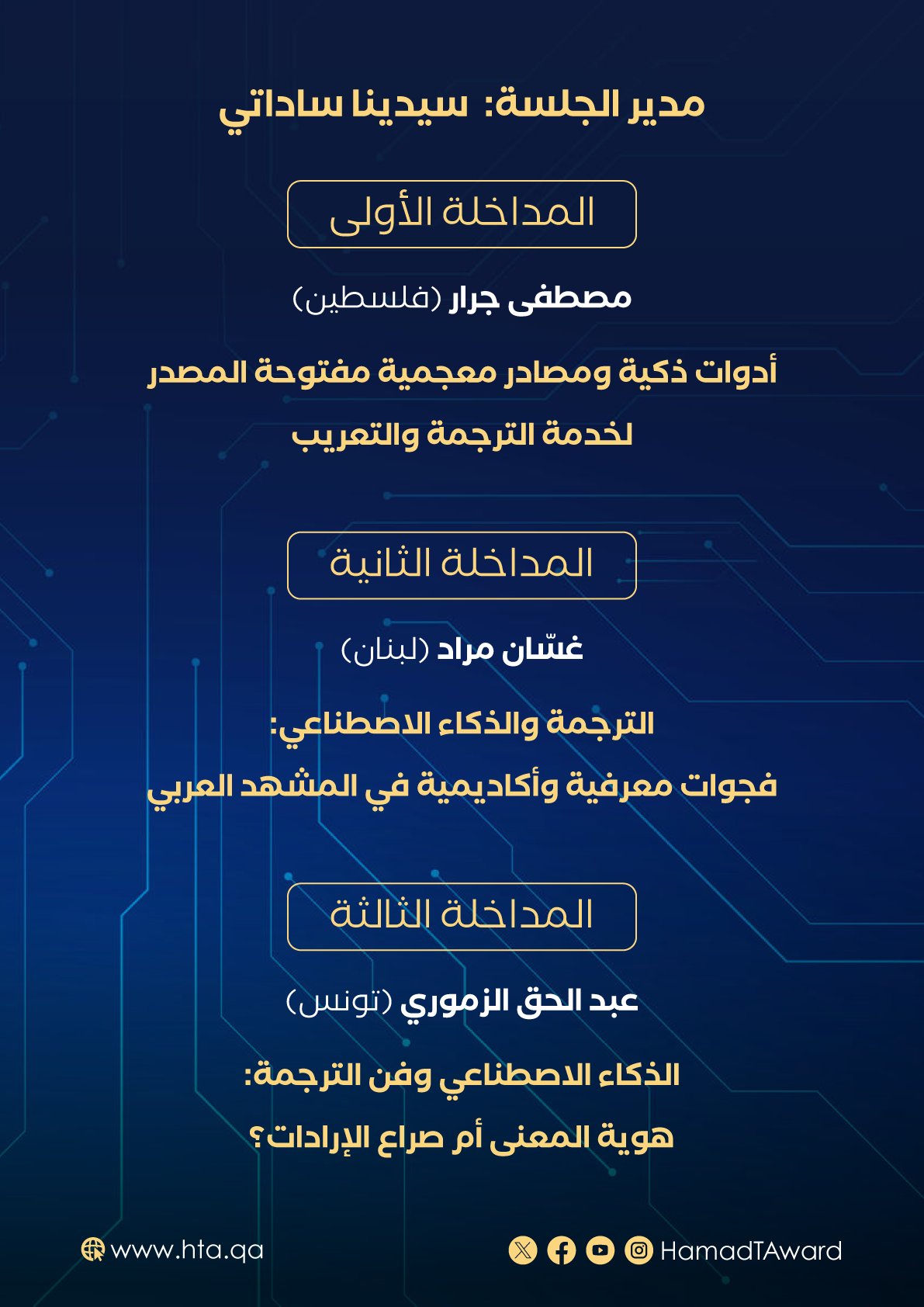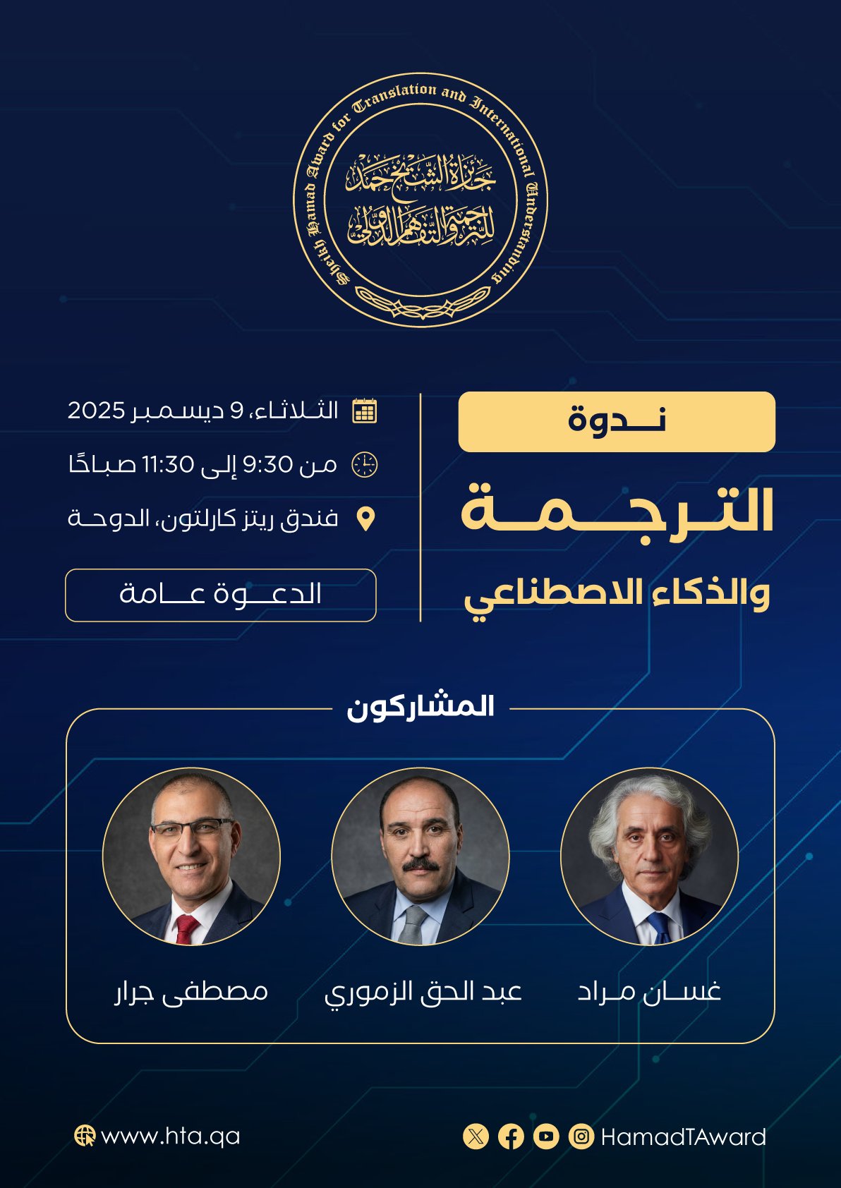 تنظم جائزة الشيخ حمد للترجمة والتفاهم الدولي ندوة علمية بعنوان "الترجمة والذكاء الاصطناعي" يوم الثلاثاء 9 ديسمبر 2025 من الساعة 9:30 إلى 11:30 صباحا في فندق ريتز-كارلتون – الدوحة، وذلك ضمن الفعاليات العلمية المرافقة للحفل التكريمي للفائزين في الدورة الحادية عشرة للجائزة.